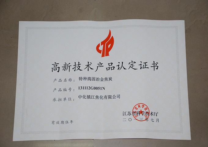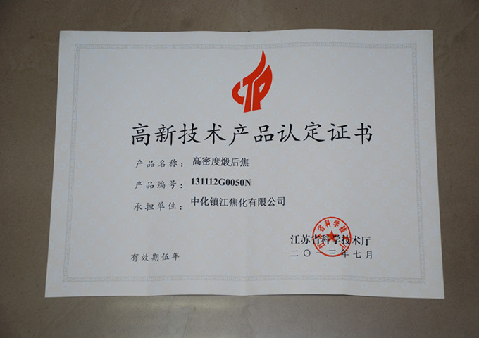 我公司高密度煅后焦,特种捣固冶金焦炭获“高新技术产品认定证书”