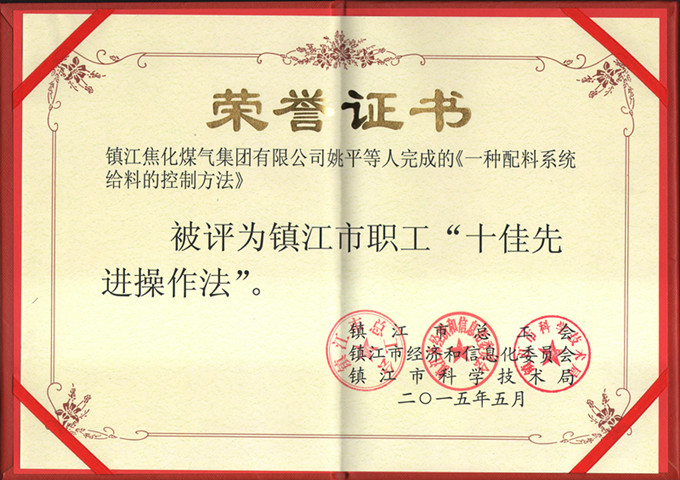 我公司在镇江市职工“十佳先进操作法”和“十佳合理化建议”评选中,分别获得表彰。